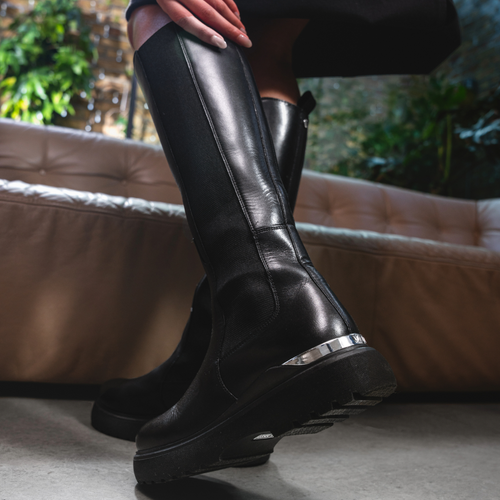 Elevate your winter wardrobe with the luxurious Alexandra Knee High Chelsea Boots, crafted from premium black smooth leather for a timeless appeal. The sleek upper features elastic gussets on either side of the leg, ensuring a comfortable fit and easy slip-on style. A stylish silver heel clip adds a touch of modern elegance.