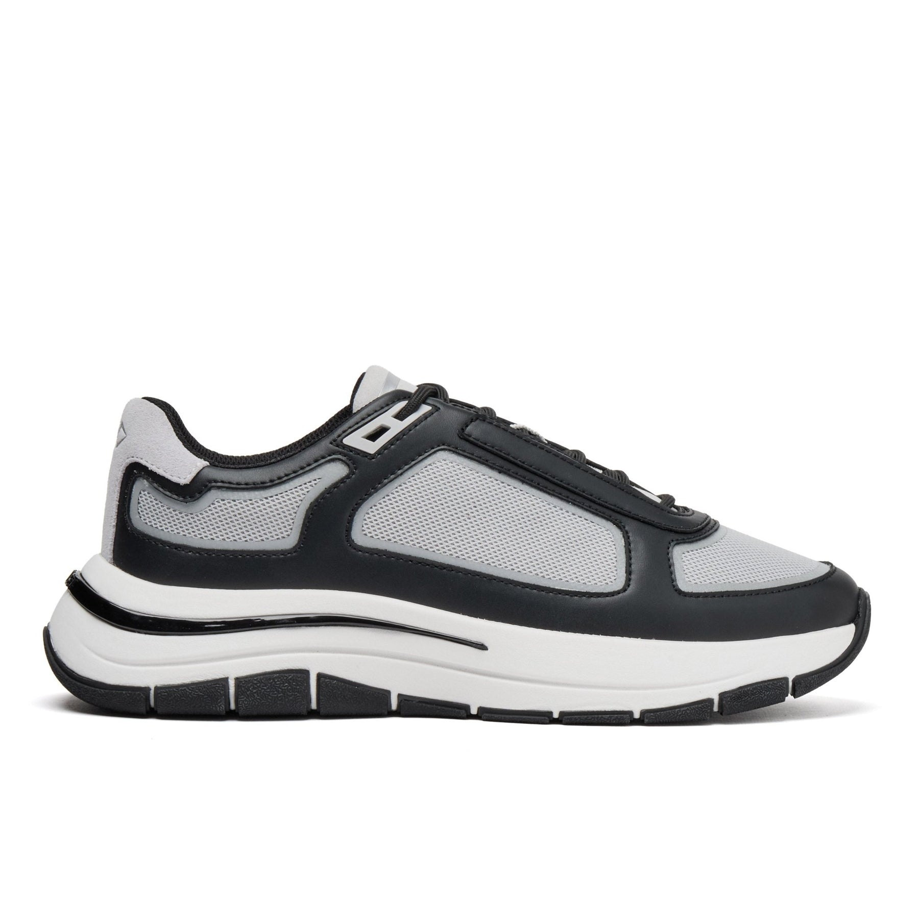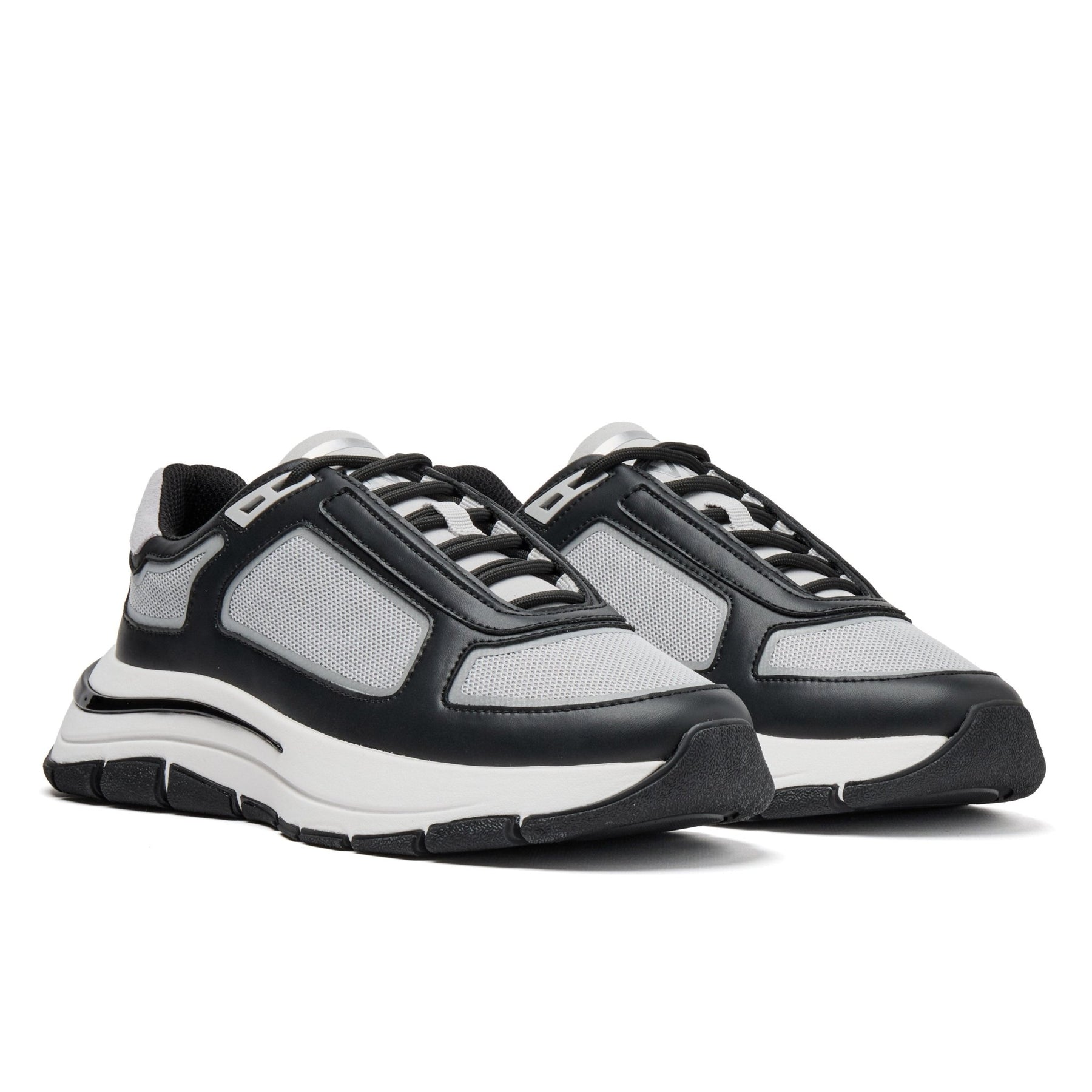 Men’s black and grey leather and chrome mesh trainers with chunky sole