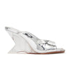 Women’s metallic silver leather wedge mules with clear heel