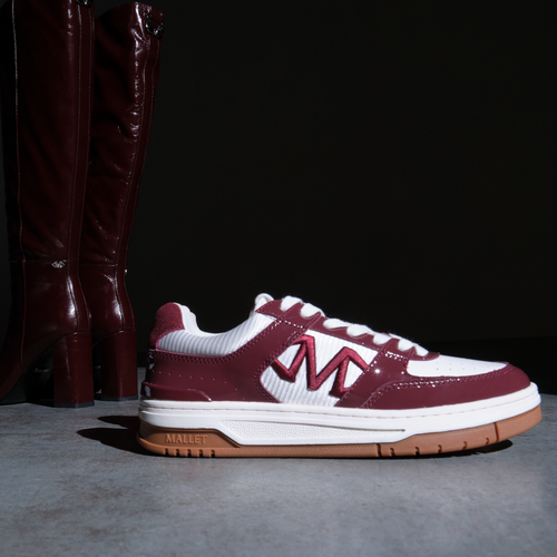 Bold luxury trainers with vibrant cranberry patent leather and classic gum sole. These premium women's trainers combine striking cranberry accents with white leather for contemporary styling.