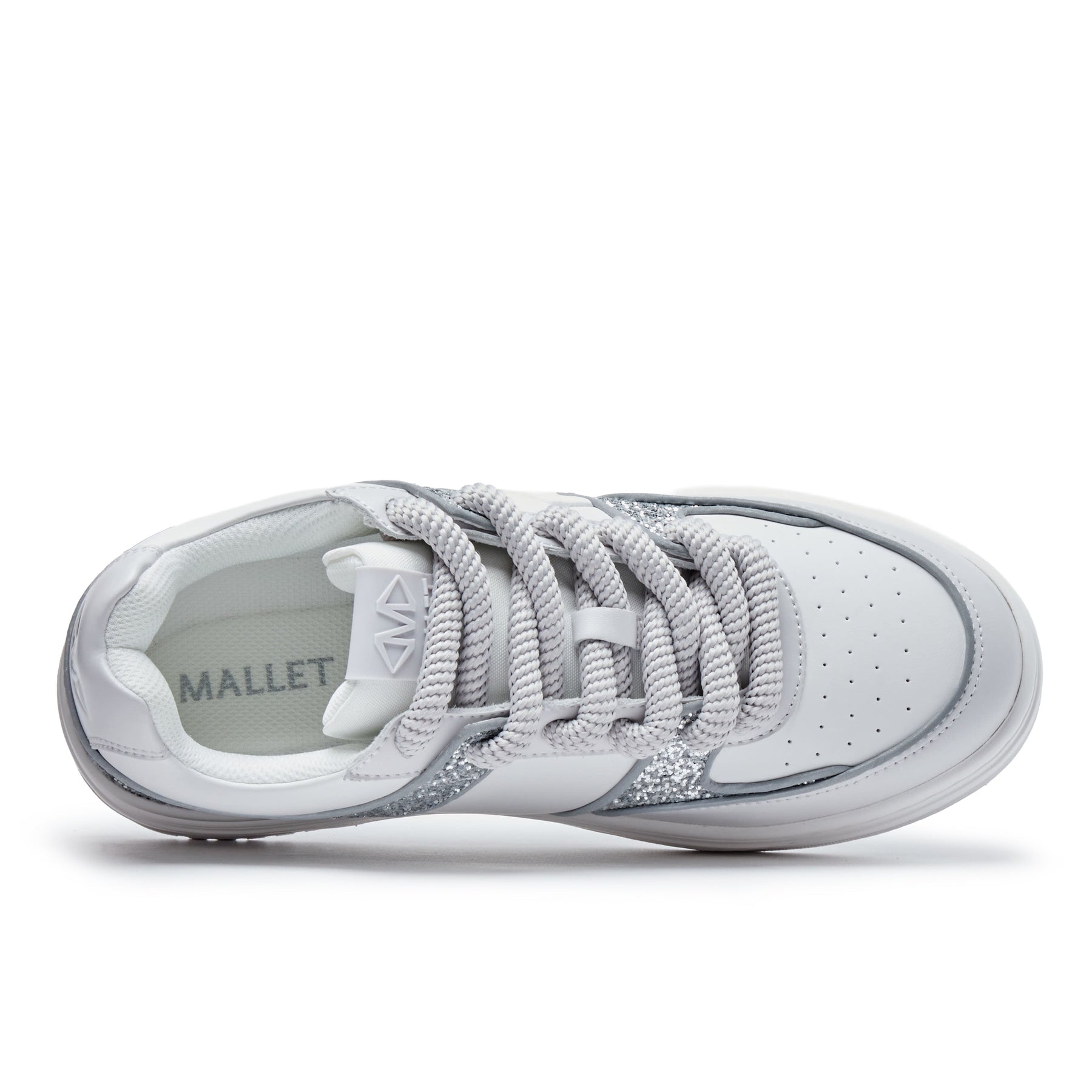 Shimmering with contemporary street style, the Clayton Grey Spark trainers merge skate-inspired design with Mallet London’s premium craftsmanship. Designed in London, these luxury trainers feature white leather underlays with silver sparkle overlays and tonal reflective details, creating a subtle yet striking finish.