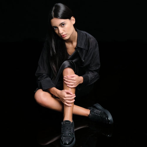 Introducing a reimagined version of the Compton, a bold fusion of streetwear attitude and luxurious elegance. The upper features sleek black shine leather, elevated with panels encrusted in over 1100 dazzling Swarovski crystals, ensuring a head-turning shine with every step. Black mesh lining provides comfort, while gold branding adds an opulent touch to this edgy silhouette. Designed for those who demand both style and exclusivity, this statement trainer is a real collector's piece for the fashion-forward.