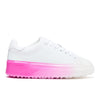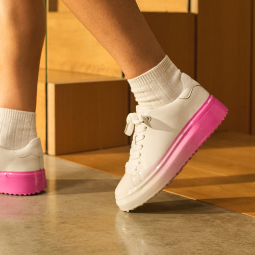 GRFTR Lite Hot Pink Fade Dip Womens delivers a modern low-top trainer with a fresh, playful finish. Crafted from premium white leather with subtle metallic accents, each pink fade dip sole is hand-finished and unique, creating a luxury casual sneaker for everyday wear.