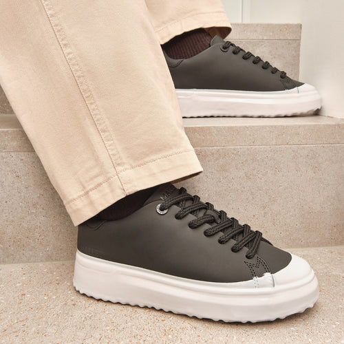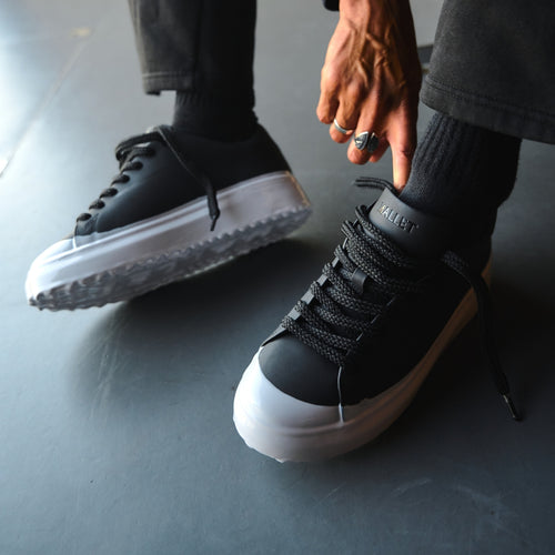 Combining urban design with sustainable innovation, the GRFTR Lite Black Ice Dip trainers offer modern street style with superior comfort. Designed in London, these luxury trainers feature a full black matt leather upper paired with a hand-dipped pale grey sole, making each pair uniquely finished.