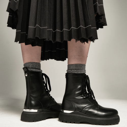 Step into sophistication with the Maddox Lace Up Boots, featuring a sleek black smooth leather upper that exudes elegance. The chunky sole not only adds a bold statement but also ensures comfort and durability, making them perfect for all-day wear.