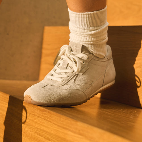 Penn Almond Gum Womens delivers a retro-inspired slim sole trainer crafted from premium Portuguese leather and washed suede. Lightweight, casual, and sustainable with LWG-certified leather, this refined runner is perfect for everyday wear.