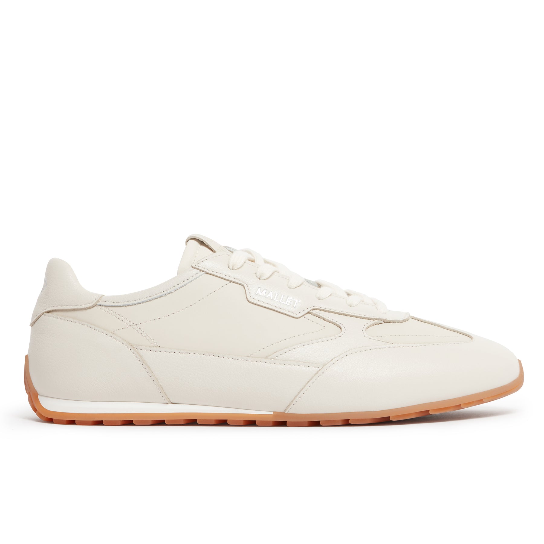 Men's white leather retro runner trainers with slim gum sole