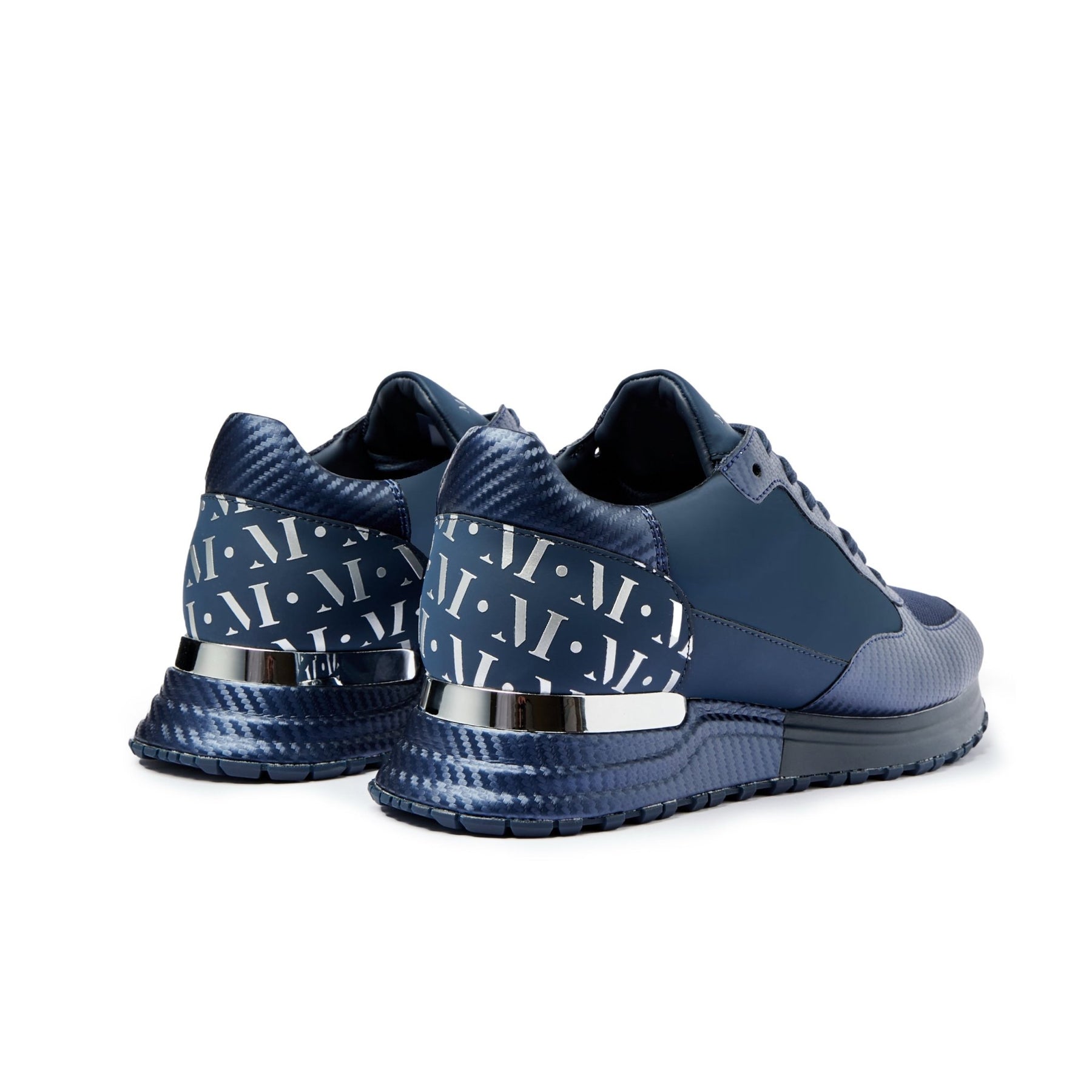The upper features breathable navy OG mesh and navy leather underlays combined with bold navy carbon fibre textile overlays, paired with smooth navy leather lower side quarters, heel tab, and heel counter. The heel counter is finished with a refined silver print Mallet monogram for subtle luxury.