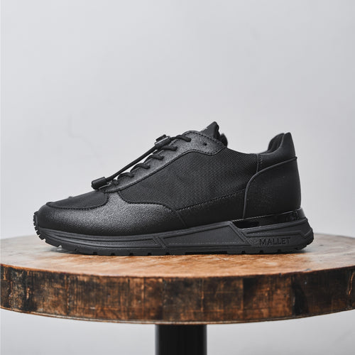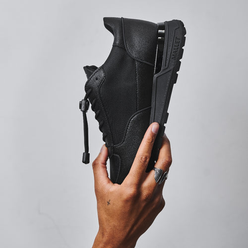 The Popham Lite Ballistic Blackout Trainer elevates technical design with a stealth all-black finish. Crafted from water-repellent ballistic nylon and textured overlays, it blends premium function and refined streetwear style.