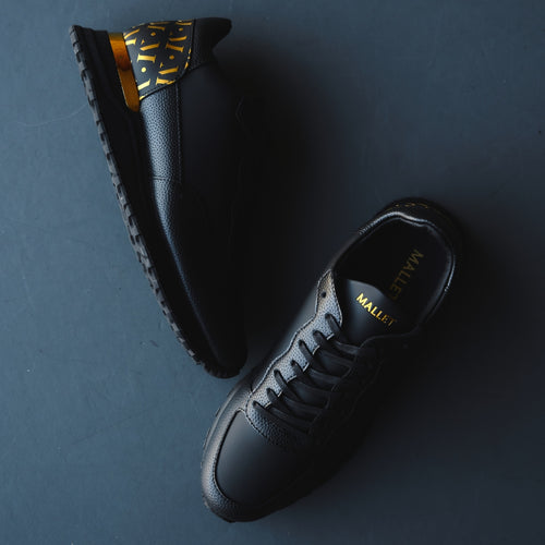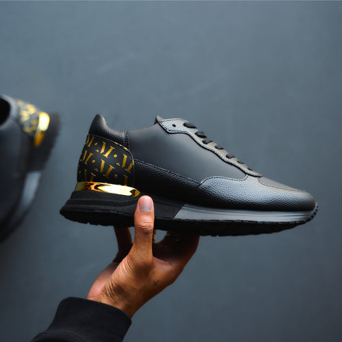 Elevate your everyday look with the Popham Tumbled Black Gold trainers, a masterclass in contemporary design and premium craftsmanship. Designed in London, these luxury trainers combine smooth matt black leather underlays with tumbled black leather overlays for rich texture and depth. Gold accents add a touch of refinement, balancing street style with sophistication.