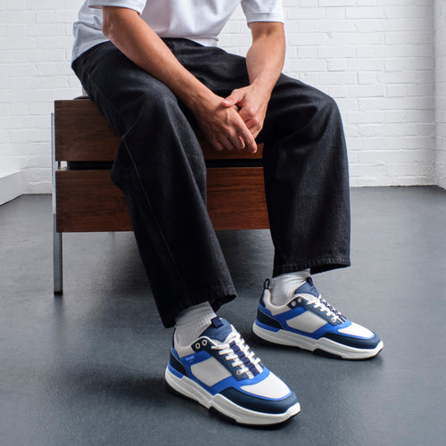The Radnor White Blue trainers combine premium materials with a bold color palette for a fresh, modern look. Featuring off-white diamond mesh underlays and rich blue leather midlays, the upper is further layered with navy leather overlays for depth and contrast.