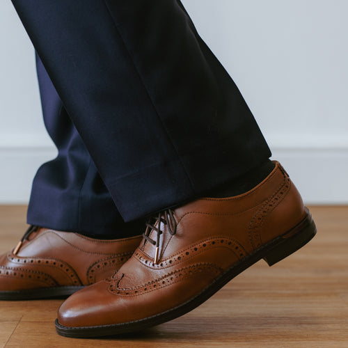 Meet Ransford, our Brogue shoe with a Mallet twist. Crafted from beautiful tan Analine leather upper with intricate brogue detailing, and full leather lining. The signature Mallet bronze TPU heel clip and bronze foil branding add a touch of luxury, while the brown rubber outsole allows for comfort and flexibility.