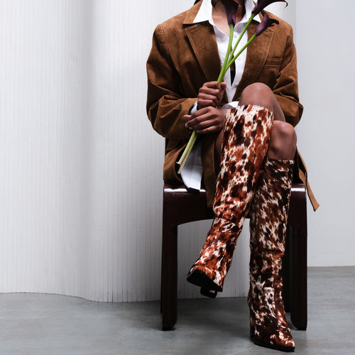 The Sabelle Knee-high Boot in Overo pony-effect leather is a bold expression of luxury and individuality. Crafted from printed pony hair leather with silver-tone accents, it’s a true statement piece for the modern wardrobe. A new range for MALLET.