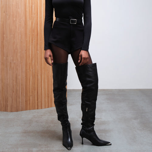 Make a bold entrance in the Sienna Boot – a sleek, thigh-high silhouette crafted in supple black leather. With a slim heel and a polished silver metal toe cap, this boot redefines modern luxury. A new range for MALLET.