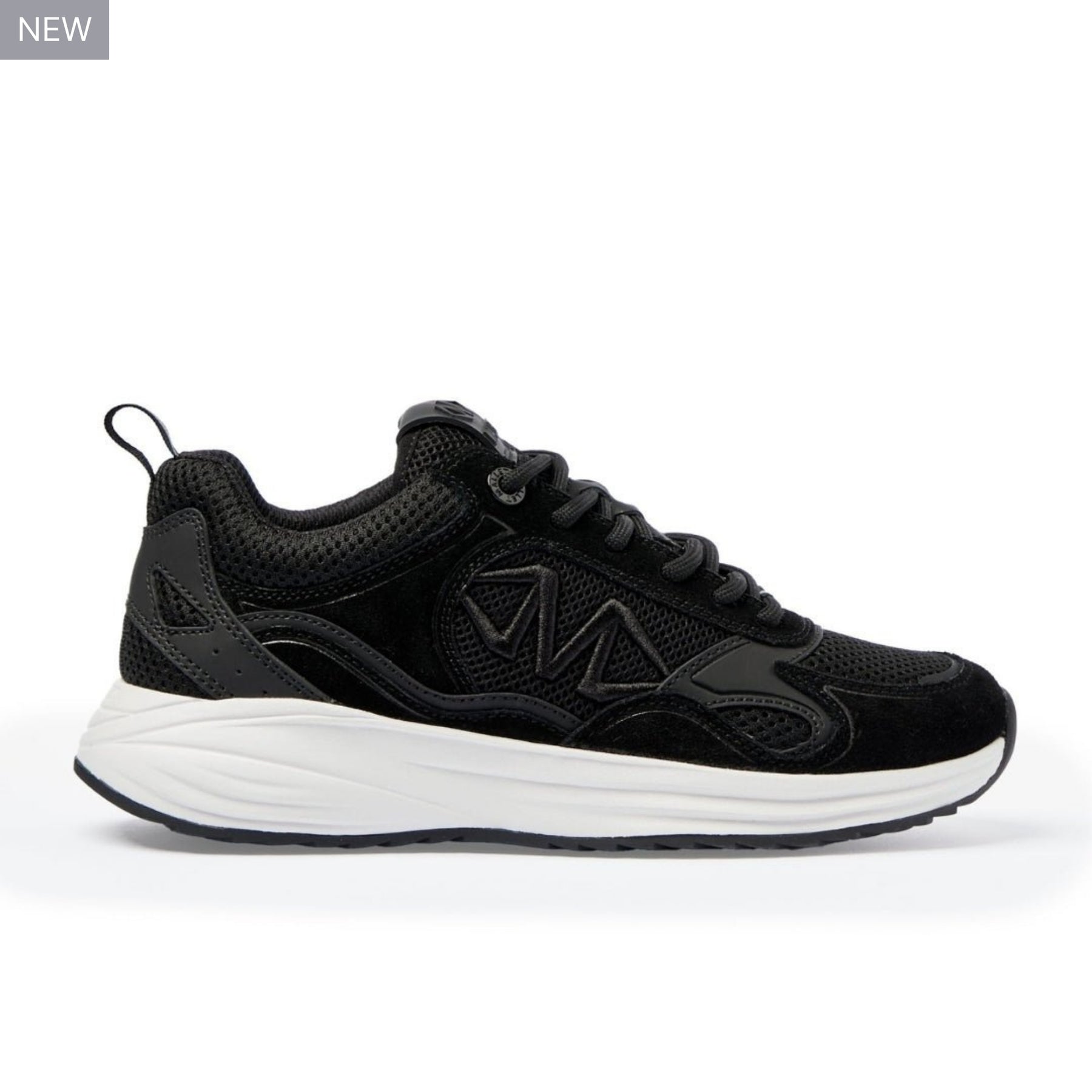 A brand new contemporary trainer featuring rich black suede and textural mesh detailing. These premium women's trainers feature sophisticated mixed materials with striking white outsole contrast for modern luxury footwear styling.